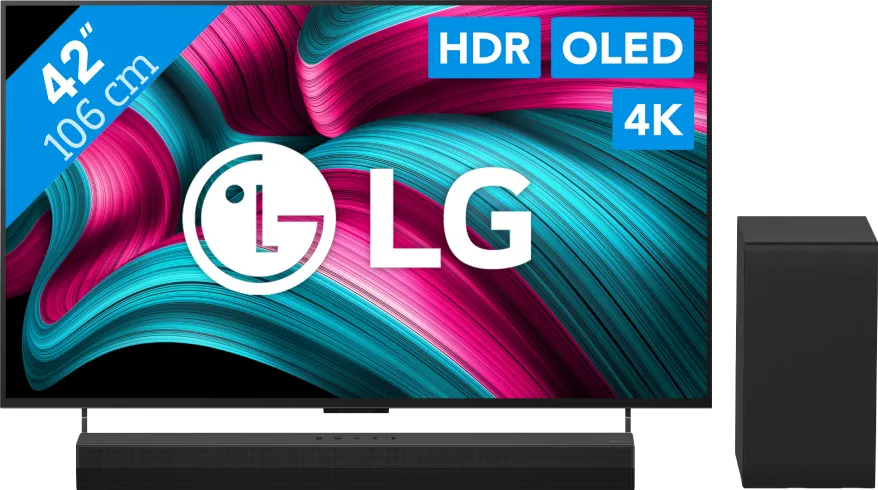 Geniet van realistische beelden en diepe bastonen met de LG 42″ OLED EVO C54 4K (2025) + LG DS40T bundel. Televisie Kijk naar realistische beelden met de diepste zwartwaarden op de LG 42″ OLED EVO C54 4K (2025). De LG C54 heeft een OLED scherm. Elke pixel op het scherm verlicht of dimt individueel, zonder achtergrondverlichting. Deze pixels kunnen zelfs helemaal uitschakelen, waardoor zwart écht zwart is. Het contrast tussen donkere en lichte beelden is groot. Lichtbronnen zoals de koplampen van een auto schijnen fel en realistisch, zonder grijze gloed. Soundbar Voeg meer bastonen aan je film of muziek toe met de LG DS40T. De meegeleverde subwoofer versterkt bastonen, waardoor je deze harder hoort. De stevige bastonen zorgen voor meer diepte in films, waardoor je ze levendiger ervaart. De soundbar geeft surround sound, waardoor je geluid van verschillende kanten hoort. Hierdoor klinkt de film of serie realistisch.