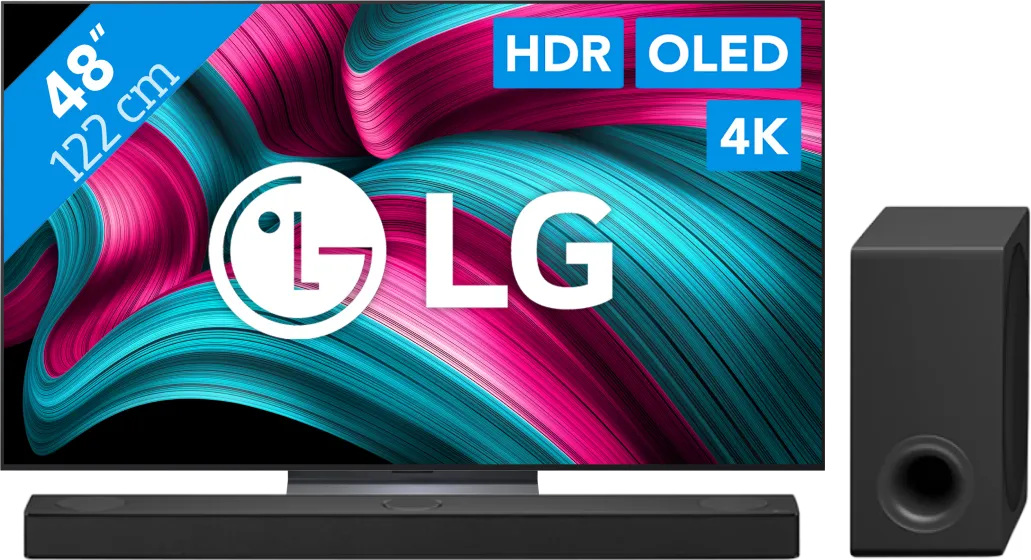 Geniet van realistische beelden en ruimtelijk geluid met de LG 48″ OLED EVO C54 4K (2025) + LG DS80TR bundel. Televisie Kijk naar realistische beelden met de diepste zwartwaarden op de LG 48″ OLED EVO C54 4K (2025). De LG C54 heeft een OLED scherm. Elke pixel op het scherm verlicht of dimt individueel, zonder achtergrondverlichting. Deze pixels kunnen zelfs helemaal uitschakelen, waardoor zwart écht zwart is. Het contrast tussen donkere en lichte beelden is groot. Lichtbronnen zoals de koplampen van een auto schijnen fel en realistisch, zonder grijze gloed. Soundbar Ga helemaal op in je favoriete film met de LG DS80TR. Door True Dolby Atmos kaatst het geluid via het plafond en de muren naar je zitplek. Je hoort zo ruimtelijk geluid, waardoor films en series realistisch klinken. Je hoort een vliegtuig in een film boven je vliegen. Bij de soundbar krijg je draadloze achterspeakers. De speakers zet je achter je zitplek, zodat je ook geluid van achteren hoort. Hierdoor omring je jezelf helemaal met geluid. De subwoofer versterkt de bastonen en geeft meer diepte aan films.