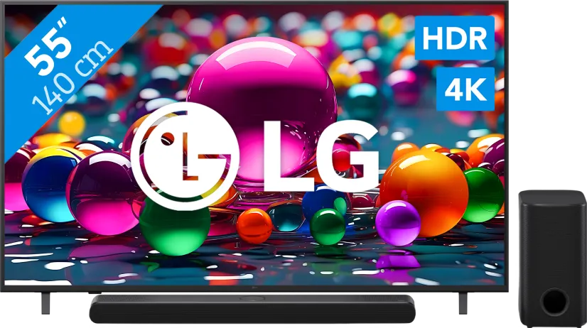 Geniet van realistisch beeld en geluid met de LG 55″ 4K Smart UA75 + LG DS77TY tv en soundbar bundel. Televisie Kijk naar scherpe 4K beelden met de LG 55″ Smart UA75 4K (2025). Deze tv heeft een 4K resolutie. Hierdoor zie je 4 keer meer detail dan op een full hd tv. Je mist niets van je favoriete films, series of games. De 55 inch UA75 heeft webOS als smart platform. Zo heb je snel toegang tot apps en streaming services, zonder aparte mediabox of Chromecast. Je zet in een handomdraai een YouTube video of Netflix serie op. Soundbar De LG DS77TY verandert je woonkamer in een echte thuisbioscoop. Dankzij de meegeleverde subwoofer hoor je diepe bastonen. Hierdoor klinkt bijvoorbeeld de opname van een concert indrukwekkend. In combinatie met Dolby Atmos geniet je van surround geluid. Dolby Atmos produceert geluid dat van alle kanten lijkt te komen. Dit komt goed tot zijn recht wanneer een helikopter over het hoofd van de hoofdrolspeler vliegt in een actiefilm.