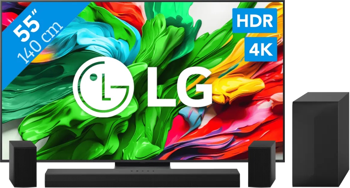 Geniet van kleurrijke beelden en realistisch geluid met de LG 55″ QNED86 EVO 4K (2025) + LG DS60TR bundel. Televisie Kijk naar kleurrijke beelden met de LG 55″ QNED86 EVO 4K (2025). Deze tv heeft een QNED scherm. Achter het scherm zitten piepkleine deeltjes die licht filteren. Hierdoor kijk je naar beelden met een hoge helderheid en rijke kleuren. De 55 inch QNED86 ondersteunt verschillende HDR formaten, zoals Dolby Vision. HDR beelden hebben een krachtig contrast en maken je kijkervaring realistisch. Het verschil tussen donker en licht op het scherm is groot. Soundbar Je haalt met de LG DS60TR een soundbar met achterspeakers in huis voor ruimtelijk surround geluid. De meegeleverde achterspeakers zorgen ervoor dat je ook geluid van achteren hoort. Hierdoor omring je je helemaal met geluid en ga je in de film op. De subwoofer versterkt bastonen, waardoor je deze tonen harder hoort. Het geluid krijgt hierdoor meer diepte, waardoor het realistischer klinkt. Zo klinken explosies uit de film intenser.