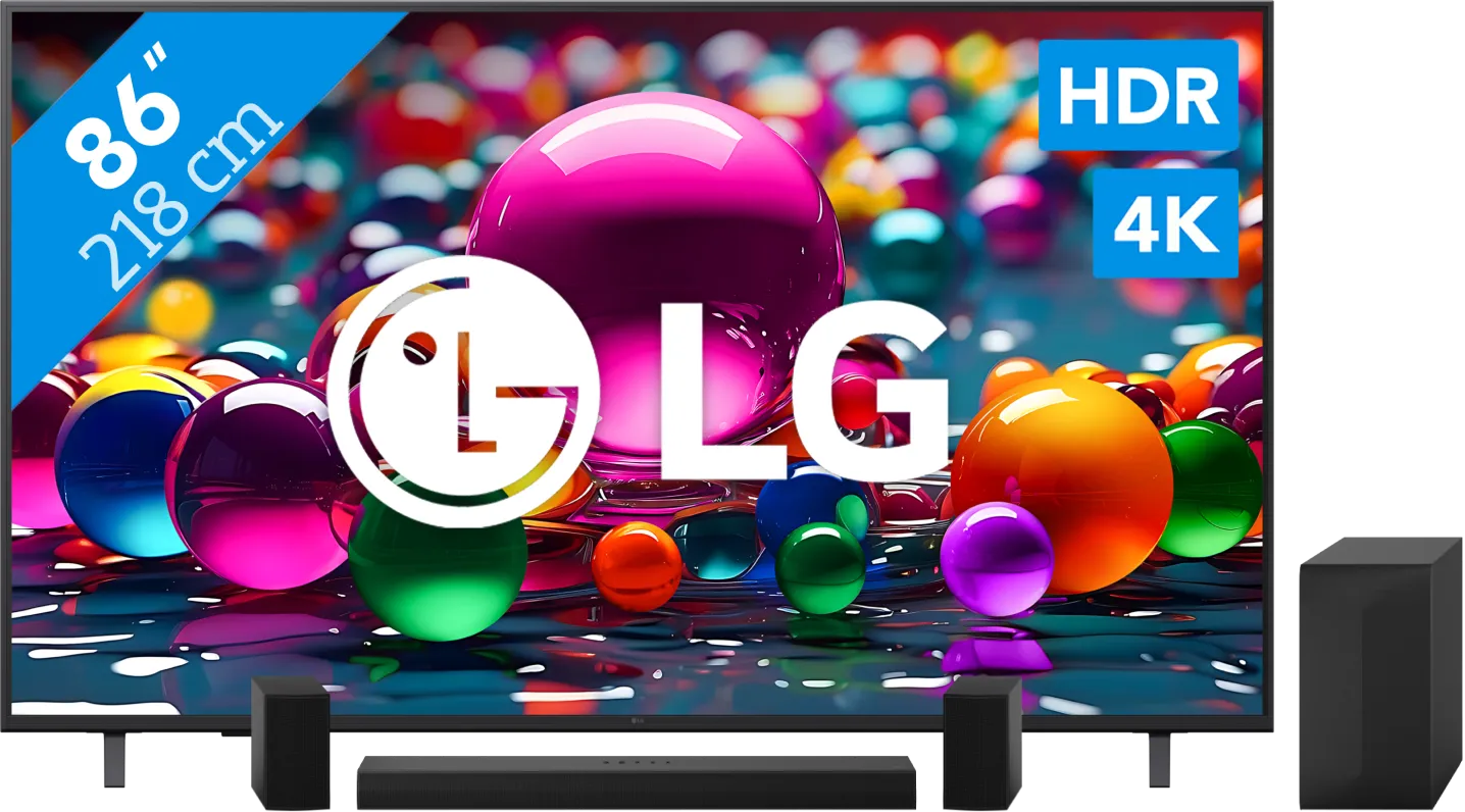 Geniet van 4K beelden en ruimtelijk geluid met deze LG 86″ QNED82 4K (2025) + LG DS60TR bundel. Televisie Kijk naar 4K beelden op een groot scherm met de LG 86″ Smart UA75 4K (2025). Deze tv heeft een 4K resolutie. Hierdoor zie je 4 keer meer detail dan op een full hd tv. Je mist niets van je favoriete films, series of games. De 86 inch UA75 heeft webOS als smart platform. Zo heb je snel toegang tot apps en streaming services, zonder aparte mediabox of Chromecast. Je zet in een handomdraai een YouTube video of Netflix serie op. Soundbar Je haalt met de LG DS60TR een soundbar met achterspeakers in huis voor ruimtelijk surround geluid. De meegeleverde achterspeakers zorgen ervoor dat je ook geluid van achteren hoort. Hierdoor omring je je helemaal met geluid en ga je in de film op. De subwoofer versterkt bastonen, waardoor je deze tonen harder hoort. Het geluid krijgt hierdoor meer diepte, waardoor het realistischer klinkt. Zo klinken explosies uit de film intenser.