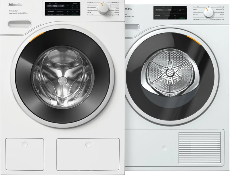 Je doet grote ladingen was en vermindert strijkwerk met de Miele WSJ 883 WCS + Miele TSL 783 WP wasmachine en droger set. Wasmachine Met 9 kilogram vulgewicht heb je ruimte voor grote ladingen beddengoed of kleding. TwinDos doseert het UltraPhase wasmiddel automatisch in 2 fasen. Hierdoor was je extra grondig schoon. Met QuickPowerWash was je een halve trommel in maar 49 minuten. Heb je geen zin in strijkwerk? SteamCare verwijdert tot 50% van de kreukels uit je was. Dat scheelt jou weer tijd. Droger Na het wassen past alles in de droogtrommel. Dankzij EcoSpeed droog je je kleding niet alleen energiezuinig, maar ook relatief snel. Met het Wash2Dry programma kiest de droger zelf het beste droogprogramma op basis van je wasprogramma. Zo kies je altijd de beste behandeling voor je favoriete kleding. Je frist muffe was op zonder wasbeurt en vermindert kreukels met het ‘stomen’ programma.