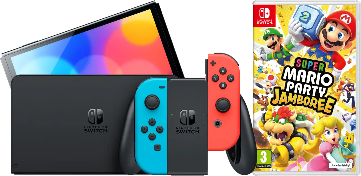 Nintendo Switch OLED Blauw Rood + Mario Party Jamboree