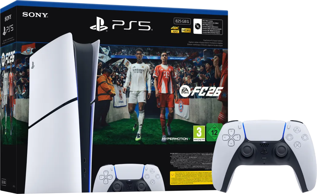 Let op: deze game is een digitale code en je hebt internet nodig om deze te verzilveren. De code krijg je erbij in de doos. Zodra je deze code hebt gebruikt, kun je de producten uit de bundel niet meer retour sturen. Trap jouw digitale voetbalseizoen samen met je vrienden af in EA Sports FC 26 en ga aan de slag met de PlayStation 5 Slim. Bij deze bundel krijg je een extra witte Sony DualSense controller meegeleverd. Met de PlayStation 5 Slim Digital Edition breng je jouw game ervaring naar een hoger niveau. Deze PlayStation 5 Digital Edition heeft geen cd lade, waardoor je geen games op disc of blu-ray films afspeelt. Wil je dit wel? Dan installeer je gemakkelijk de los verkrijgbare Disc Drive op je Digital Edition. Zo speel je alsnog fysieke games en kijk je ook blu-ray films. De PS5 Slim is 30 procent kleiner dan zijn voorganger. Hierdoor neemt hij minder ruimte in op je bureau of naast je tv. Daarnaast heeft de Slim een opslag van 825 gigabyte. Door de krachtige grafische processor in deze console game je in 4K resolutie met een maximale verversingssnelheid van 120 hertz. De SSD zorgt voor 20 keer snellere laadtijden in games dan op voorgaande PlayStation consoles. Speel je veel RPG of shooter games? Met 3D audio hoor je precies waar je tegenstanders vandaan komen. In-game bestuur jij jouw personage met de meegeleverde DualSense controller. Deze heeft voelbare feedback en trigger effecten, waardoor je niet alleen ziet en hoort, maar ook voelt wat er in je game gebeurt.