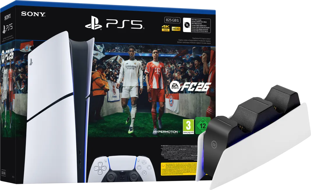 Let op: deze game is een digitale code en je hebt internet nodig om deze te verzilveren. De code krijg je erbij in de doos. Zodra je deze code hebt gebruikt, kun je de producten uit de bundel niet meer retour sturen. Trap jouw digitale voetbalseizoen af in EA Sports FC 26, laad je controller op en ga aan de slag met de PlayStation 5 Slim. Met de PlayStation 5 Slim Digital Edition breng je jouw game ervaring naar een hoger niveau. Ben je klaar met gamen? Dan leg je de DualSense controller in het oplaadstation. Zo speel je altijd met een volle accu tijdens je volgende game sessie. Deze PlayStation 5 Digital Edition heeft geen cd lade, waardoor je geen games op disc of blu-ray films afspeelt. Wil je dit wel? Dan installeer je gemakkelijk de los verkrijgbare Disc Drive op je Digital Edition. Zo speel je alsnog fysieke games en kijk je ook blu-ray films. De PS5 Slim is 30 procent kleiner dan zijn voorganger. Hierdoor neemt hij minder ruimte in op je bureau of naast je tv. Daarnaast heeft de Slim een opslag van 825 gigabyte. Door de krachtige grafische processor in deze console game je in 4K resolutie met een maximale verversingssnelheid van 120 hertz. De SSD zorgt voor 20 keer snellere laadtijden in games dan op voorgaande PlayStation consoles. Speel je veel RPG of shooter games? Met 3D audio hoor je precies waar je tegenstanders vandaan komen. In-game bestuur jij jouw personage met de meegeleverde DualSense controller. Deze heeft voelbare feedback en trigger effecten, waardoor je niet alleen ziet en hoort, maar ook voelt wat er in je game gebeurt.