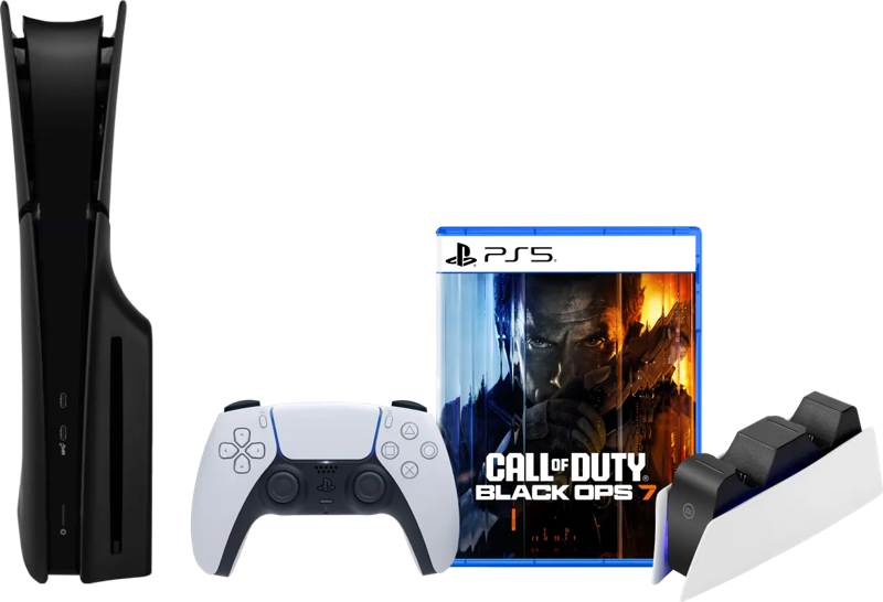 Stap in de toekomst, vecht voor de waarheid in Call of Duty: Black Ops 7 en ga aan de slag met een zwarte PlayStation 5 Slim. Ben je klaar met gamen? Dan leg je de DualSense controller in het oplaadstation. Zo speel je altijd met een volle accu tijdens je volgende game sessie. Je maakt jouw PlayStation 5 zwart met de meegeleverde covers. Hierdoor kleurt hij goed bij de rest van je setup. Met de PlayStation 5 Slim Disc Edition breng je jouw game ervaring naar een hoger niveau. Deze PlayStation 5 heeft een cd lade, waardoor je naast games ook blu-ray films afspeelt. De PS5 Slim is 30 procent kleiner dan zijn voorganger. Hierdoor neemt hij minder ruimte in op je bureau of naast je tv. Daarnaast heeft de Slim een opslag van 1 terabyte, waar de originele PlayStation 5 825 gigabyte opslagruimte heeft. Door de krachtige grafische processor in deze console game je in 4K resolutie met een maximale verversingssnelheid van 120 hertz. De SSD zorgt voor 20 keer snellere laadtijden in games dan op voorgaande PlayStation consoles. Speel je veel RPG of shooter games? Met 3D audio hoor je precies waar je tegenstanders vandaan komen. In-game bestuur jij jouw personage met de meegeleverde DualSense controller. Deze heeft voelbare feedback en trigger effecten, waardoor je niet alleen ziet en hoort, maar ook voelt wat er in je game gebeurt.