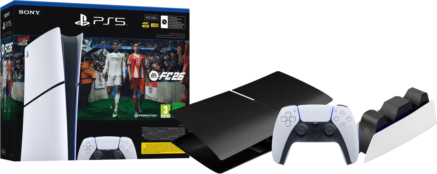 Let op: deze game is een digitale code en je hebt internet nodig om deze te verzilveren. De code krijg je erbij in de doos. Zodra je deze code hebt gebruikt, kun je de producten uit de bundel niet meer retour sturen. Trap jouw digitale voetbalseizoen samen met je vrienden af in EA Sports FC 26 en maak je PlayStation 5 Slim zwart. Bij deze bundel krijg je een extra witte Sony DualSense controller meegeleverd. Ben je klaar met gamen? Dan leg je de DualSense controller in het oplaadstation. Zo speel je altijd met een volle accu tijdens je volgende game sessie. Je maakt jouw PlayStation 5 zwart met de meegeleverde covers. Hierdoor kleurt hij goed bij de rest van je setup. Met de PlayStation 5 Slim Digital Edition breng je jouw game ervaring naar een hoger niveau. Deze PlayStation 5 Digital Edition heeft geen cd lade, waardoor je geen games op disc of blu-ray films afspeelt. Wil je dit wel? Dan installeer je gemakkelijk de los verkrijgbare Disc Drive op je Digital Edition. Zo speel je alsnog fysieke games en kijk je ook blu-ray films. De PS5 Slim is 30 procent kleiner dan zijn voorganger. Hierdoor neemt hij minder ruimte in op je bureau of naast je tv. Daarnaast heeft de Slim een opslag van 825 gigabyte. Door de krachtige grafische processor in deze console game je in 4K resolutie met een maximale verversingssnelheid van 120 hertz. De SSD zorgt voor 20 keer snellere laadtijden in games dan op voorgaande PlayStation consoles. Speel je veel RPG of shooter games? Met 3D audio hoor je precies waar je tegenstanders vandaan komen. In-game bestuur jij jouw personage met de meegeleverde DualSense controller. Deze heeft voelbare feedback en trigger effecten, waardoor je niet alleen ziet en hoort, maar ook voelt wat er in je game gebeurt.