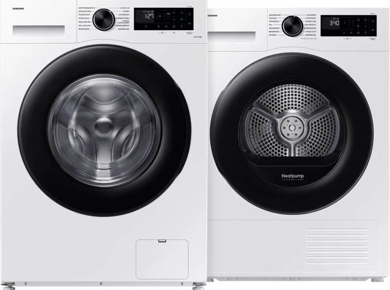 Je wast en droogt grote ladingen energiezuinig met de Samsung WW90CGC04AAE + Samsung DV90DG52A0AEEN wasmachine en droger set. Wasmachine Met 9 kilogram vulgewicht heb je ruimte voor een grote lading beddengoed, opgespaarde kleding of handdoeken. Je kiest uit 1 van de 14 wasprogramma’s. Bij last van allergieën of een gevoelige huid kies je voor het hygiënisch stomen programma. Hiermee verwijdert de wasmachine bacteriën en allergenen met stoom. Via de SmartThings app download je gemakkelijk extra programma’s voor je was. Zo vind je altijd het juiste wasprogramma. Droger Al je natte was past direct in de droogtrommel. Je droogt je lakens en babykleding extra hygiënisch met Hygiene Care. Kies het Quick Dry 35′ programma als je je favoriete outfit snel wilt drogen. Je haalt je natte was na 35 minuten droog uit de trommel. Wil je een kleine lading drogen? De OptimalDry sensoren passen de programmaduur en het verbruik automatisch aan op iedere hoeveelheid was, zodat je altijd zuinig droogt.