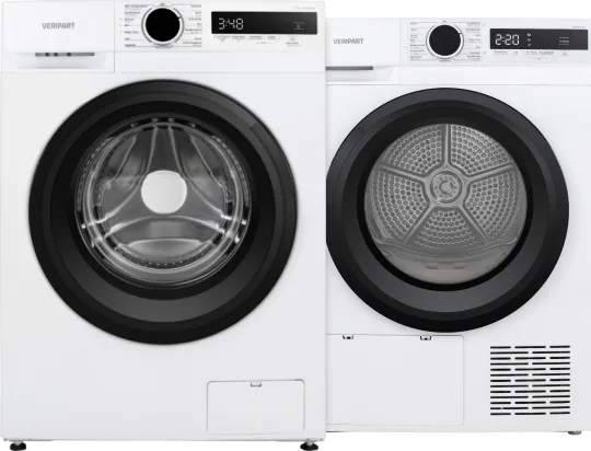 De Veripart VPWM1400A19WNB + Veripart VPDR9CWNB wast en droogt zuinig een grote lading beddengoed in één keer. Wasmachine Je wast tot 9 kilogram schoon met keuze uit 15 programma¿s, waaronder katoen, sportkleding en gemixte was. Het programma hygiënisch stomen verwijdert bacteriën en allergenen. Ook het programma voor babykleding wast grondig schoon. Je bespaart tot €: 245,- op je energiekosten over de levensduur dankzij energieklasse A-10%. Droger Met deze warmtepompdroger droog je 9 kilogram was in één keer, zoals beddengoed of handdoeken. Een volle trommel is binnen 3,5 uur droog. Dankzij energieklasse C bespaar je tot €: 200,- op je energierekening. Kies uit programma¿s voor katoen, synthetische was of delicate stoffen. De vochtigheidssensor stopt je droger automatisch, zodat je energie bespaart en je kleding langer mooi blijft.